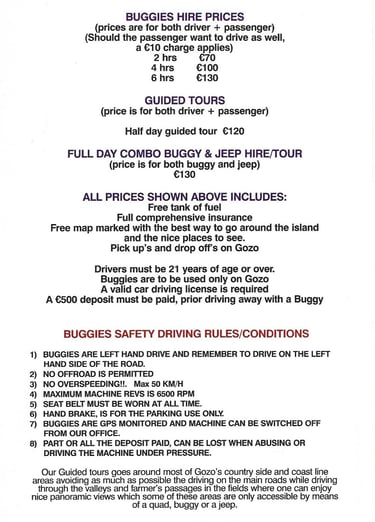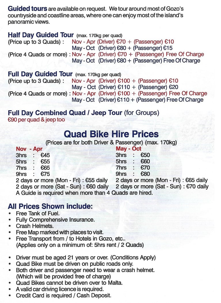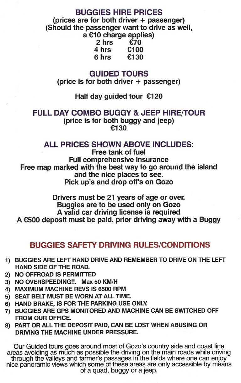 Explore the stunning landscapes of Gozo island in Malta while embarking on an exhilarating adventure with quad bike and buggy tours. Discover the hidden gems of the countryside and be captivated by the breathtaking coastlines as you maneuver through the rugged terrains. This thrilling experience allows you to immerse yourself in the natural beauty of the island while enjoying an adrenaline-filled ride. Quad bikes and buggies provide the perfect mode of transport for exploring off-the-beaten-path locations that are inaccessible by traditional means. Whether you are a nature enthusiast or an adventure seeker, this tour offers an unforgettable way to discover Gozo's diverse landscapes. So, make the most of your holiday and embark on an unforgettable quad bike or buggy tour. For more details and booking information, please refer to the details below.